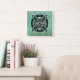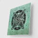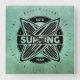 Badge style surf graphic features crossed surfboards and bold centre "surfing" text. Grunged teal background