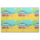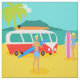 Every day can be a day at the beach with this Retro Surfer Couple Fabric. The 1960's style, minimalist art design features a fun-loving, sun worshiping, thrill seeking couple all ready to catch a wave. The setting is a tropical, island oasis with a beach of golden sand, swaying, green palm trees, a sparkling, peacock blue ocean, and an aqua sky. In the distance, we can see a teal volcanic island, which is dormant for the time being. Back on the beach, we can't help noticing the sweet ride that brought our couple to their dream destination. It's a mid century modern, red and white van with an orange and yellow surfboard strapped to the top. Though we can't be sure, it's fair to assume that the inside of the van features groovy, shag carpeting and the smell of incense! Surfer Dude and Beach Babe have matching sun-kissed tans, sun-bleached hair, and blue, tiki patterned swimsuits. Surfer Dude is holding a blue surfboard. Beach Babe is standing beside her two-toned, pink surfboard. Lying nearby, there is a red and white beach ball, waiting to fulfil its summer destiny. Catch some waves and share some love with this kitschy summer design!