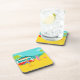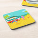 Every day can be a day at the beach with these Retro Surfer Couple Hard Plastic Coasters. The 1960's style, minimalist art design features a fun-loving, sun worshiping, thrill seeking couple all ready to catch a wave. The setting is a tropical, island oasis with a beach of golden sand, swaying, green palm trees, a sparkling, peacock blue ocean, and an aqua sky. In the distance, we can see a teal volcanic island, which is dormant for the time being. Back on the beach, we can't help noticing the sweet ride that brought our couple to their dream destination. It's a mid century modern, red and white van with an orange and yellow surfboard strapped to the top. Though we can't be sure, it's fair to assume that the inside of the van features groovy, shag carpeting and the smell of incense! Surfer Dude and Beach Babe have matching sun-kissed tans, sun-bleached hair, and blue, tiki patterned swimsuits. Surfer Dude is holding a blue surfboard. Beach Babe is standing beside her two-toned, pink surfboard. Lying nearby, there is a red and white beach ball, waiting to fulfil its summer destiny. Catch some waves and share some love with this kitschy summer design!