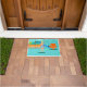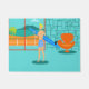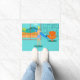 Every day can be a day at the beach with this Retro Surfer Dude Door Mat. The 1960's style, minimalist art design features a sun-kissed, blonde, surfer dude all ready to catch a wave. Our fit surfer is gazing out on the ocean through the sliding glass doors of his beachfront home. He is standing in his aqua coloured living room. We can see an aqua and turquoise, stone wall and mid century modern, orange chair. On the opposite side of the glass door, we can see a patio. Beyond that, there is a golden, sandy beach, swaying palm tree, sparkling, peacock blue ocean, and an aqua sky. In the distance, we can see a teal volcanic island, which is dormant for the time being. Surfer Dude is holding a blue surfboard and wearing blue, tiki patterned board shorts. Catch some waves and share some love with this kitschy summer design!