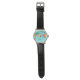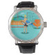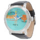 Every day can be a day at the beach with this Retro Surfer Dude Men's Watch. The 1960's style, minimalist art design features a sun-kissed, blonde, surfer dude all ready to catch a wave. Our fit surfer is gazing out on the ocean through the sliding glass doors of his beachfront home. He is standing in his aqua coloured living room. We can see an aqua and turquoise, stone wall and mid century modern, orange chair. On the opposite side of the glass door, we can see a patio. Beyond that, there is a golden, sandy beach, swaying palm tree, sparkling, peacock blue ocean, and an aqua sky. In the distance, we can see a teal volcanic island, which is dormant for the time being. Surfer Dude is holding a blue surfboard and wearing blue, tiki patterned board shorts. Catch some waves and share some love with this kitschy summer design!