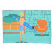 Every day can be a day at the beach with this Retro Surfer Dude Pillowcase. The 1960's style, minimalist art design features a sun-kissed, blonde, surfer dude all ready to catch a wave. Our fit surfer is gazing out on the ocean through the sliding glass doors of his beachfront home. He is standing in his aqua coloured living room. We can see an aqua and turquoise, stone wall and mid century modern, orange chair. On the opposite side of the glass door, we can see a patio. Beyond that, there is a golden, sandy beach, swaying palm tree, sparkling, peacock blue ocean, and an aqua sky. In the distance, we can see a teal volcanic island, which is dormant for the time being. Surfer Dude is holding a blue surfboard and wearing blue, tiki patterned board shorts. Catch some waves and share some love with this kitschy summer design!