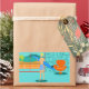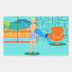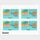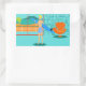 Every day can be a day at the beach with these Retro Surfer Dude Stickers. The 1960's style, minimalist art design features a sun-kissed, blonde, surfer dude all ready to catch a wave. Our fit surfer is gazing out on the ocean through the sliding glass doors of his beachfront home. He is standing in his aqua coloured living room. We can see an aqua and turquoise, stone wall and mid century modern, orange chair. On the opposite side of the glass door, we can see a patio. Beyond that, there is a golden, sandy beach, swaying palm tree, sparkling, peacock blue ocean, and an aqua sky. In the distance, we can see a teal volcanic island, which is dormant for the time being. Surfer Dude is holding a blue surfboard and wearing blue, tiki patterned board shorts. Catch some waves and share some love with this kitschy summer design!