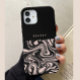 A black and cream iPhone case designed with plain black on the top half, and a pattern of retro swirls on the bottom half of the case. Feel free to customise with your name or initials, or leave the personalisation section blank.
