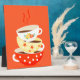 A retro cute, vintage image illustration of three retro style old fashioned tea cups stacked on top of one another against a bright orange on trend background. This whimsical design is for tea and coffee lovers everywhere.