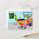 This customisable Retro Teacher Postcard gets an A+! This 1960's style, minimalist art, cartoon drawing features a vibrant, elementary classroom with everything needed to mould the minds of the future. It's the sort of room where ideas are valued and creativity is praised. At the front of the mid century modern classroom, we see the school's most popular teacher standing in front of a chalkboard. Teacher is wearing a bright green and yellow dress, with yellow shoes. Even though the clock on the blue wall tells us it is almost time for the final bell to ring, she still looks as fresh as a daisy. Her black hair is kept in place with a yellow headband and her mod, red glasses help her see to curtail any mischief on the back row. She is resting one hand on her orange and black desk. The clean desk is a tribute to her fine organisational skills. The only thing on the desktop is a shiny, red apple, which was undoubtedly given to her by an adoring student. Speaking of students... We can see a couple of those, as well. From our vantage point, we can see two eager students sitting behind their red, school desks. There is a blonde girl with a bouncy ponytail wearing a bright pink dress. Next to her, there is a dark haired lad wearing a green shirt and blue jeans. Each child is holding a bright blue school book. They are so eager to learn that they haven't even noticed it is almost time for them to board the yellow school bus we see waiting for them through the open blinds on the classroom window. Beneath the window, there is an orange bookshelf holding colourful books and a globe of the world. Don't worry, kids. Tomorrow, you will be back in your places with bright, shining faces. The name on the chalkboard is customisable.
