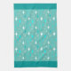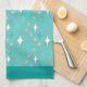 A kitchen towel with a retro star pattern in teal and white on a light teal background and dark teal borders.