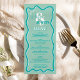 A cool bold wedding menu with custom names with a hand written calligraphy and serif font, 2 names , two styles with Retro boho teal blue curve squiggle wavy wedding. All the text, names and background colours are customisable for you to mix and match your wedding suite.