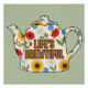 A flowered cream teapot on a pale sage colored background with teabag colored words that spell Life's Brewtiful.