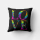 Groovy throw pillow features retro style tie dye stacked "Love" letters on black background