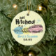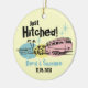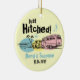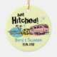 Fun vintage design ornament featuring a retro trailer hitched to a car driving to their beach honeymoon. Stamp style text says JUST HITCHED. Perfect wedding shower or engagement gift for the newlyweds. Personalise it with whatever you like. Coordinated T-shirts, tote bags, save the date announcements and magnets, thank you notes, postage stamps and more! PinkInkArt original!