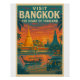 Retro travel poster of Bangkok, Thailand — featuring the Grand Palace with its golden rooftops and Wat Arun in the distance, a traditional longtail boat cruising on the Chao Phraya River.