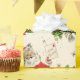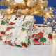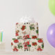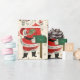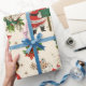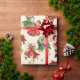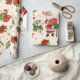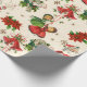 This wrapping paper features a charming retro Christmas pattern with a cream-coloured background. The design includes repeating images of a jolly Santa Claus standing next to a green mailbox, a young girl in a red and green dress ringing a bell, bright red poinsettias, and clusters of holly and bells. Small snowflakes and starbursts are scattered throughout the pattern, giving it a vintage, mid-century holiday card aesthetic.