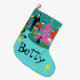 This customisable Retro Family Trimming the Christmas Tree Holiday Stocking contains every holiday tradition but the fruitcake. A 1960's cartoon family is at home in their mid century modern living room. There is a turquoise and teal brick wall and a red, cone fireplace with a roaring fire. Dad is wearing a black suit and red tie. He is hanging green Christmas stockings on the mod chimney with care. Next to dad, Junior is perched precariously on an orange chair. Whoa! Easy there, Junior! He is reaching out to put an ornament on a kitchy, pink, Christmas tree that is already decked out with teal ornaments and a yellow star. On the opposite side of the tree, Mum is holding a festively wrapped present. Hey, no shaking allowed! Mum is wearing a bright red wiggle dress with white trim. She is also wearing a Santa hat. Beneath the tree, there is a sleek black cat wearing a red bow. On the floor, there is a green and black record player surrounded by colourful vinyl albums. You just know that the family is singing along with their favourite Christmas carols while they are decking the halls. Below the design, two, yellow starbursts surround the name of the stocking owner. The opposite side of the stocking features a turquoise and teal brick pattern.