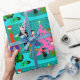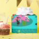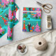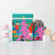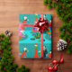 This Retro Family Trimming the Christmas Tree Wrapping Paper contains every holiday tradition but the fruitcake. A 1960's cartoon family is at home in their mid century modern living room. There is a turquoise and teal brick wall and a red, cone fireplace with a roaring fire. Dad is wearing a black suit and red tie. He is hanging green Christmas stockings on the mod chimney with care. Next to dad, Junior is perched precariously on an orange chair. Whoa! Easy there, Junior! He is reaching out to put an ornament on a kitchy, pink, Christmas tree that is already decked out with teal ornaments and a yellow star. On the opposite side of the tree, Mum is holding a festively wrapped present. Hey, no shaking allowed! Mum is wearing a bright red wiggle dress with white trim. She is also wearing a Santa hat. Beneath the tree, there is a sleek black cat wearing a red bow. On the floor, there is a green and black record player surrounded by colourful vinyl albums. You just know that the family is singing along with their favourite Christmas carols while they are decking the halls.