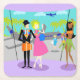 This Retro Tropical Vacation Paper Coaster features a minimalist cartoon drawing of an attractive couple taking the trip of a lifetime! The mid century modern scene is set in a tropical airport. Mr. and Mrs. Tourist are posing in front of the floor to ceiling glass walls. After all, they want to document every moment of their vacation to paradise. Mr. Tourist is dressed in a black suit, light blue shirt, red tie, and black fedora. He is holding an orange suitcase. His arm is around his beautiful bride. She is wearing a hot pink dress. A bright blue handbag is slung over one arm. Not a hair is out of place of her pretty blonde head. It wouldn't do to travel by air and not look your best! Both of them are wearing colourful flower leis around their necks. Beside them, we see a stunning, golden skinned hula girl with flowing black hair. Miss Hula is wearing a traditional grass skirt and an orange bikini top. If that top could talk, it would say, "Hey! I'm a talking top and I match the orange flower in her hair!" On one arm, she has an extra Hawaiian lei ready to offer the next person to step off the plane. Ah, can't you smell the orchids now? On the opposite side of the glass, we can see the luxury, jumbo jetliner that brought the couple to their vacation destination. On the tarmac, 1960's style flight attendant is making her way to the building. She is wearing a form fitting, blue uniform and a blue pillbox hat. Yowza! That gorgeous blonde can offer me coffee, tea, or milk anytime! The sky a shade of aqua that makes you want to reach for the suntan oil! We can see the green silhouettes of palm trees and the dark blue silhouette of a plane flying among the fluffy, light blue clouds. Oh, I hope those poor suckers on that plane aren't on their way back to the daily grind! Aloha!