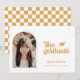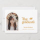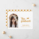 Retro Type Graduation Photo Announcement. Features, single arch frame photo, grad cap accent, retro typography in rustic vintage yellow and coordinating chequered pattern backing.
