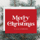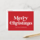 Stylish, trendy holiday postcard displaying "Merry Christmas" on the front in a white, retro style font overlay with a red background or colour of your choice. Personalise the front of the non-photo holiday postcard by adding your name/business name, the year, or other custom text. The back of the postcard features your return address and custom message in festive red text. Designed to coordinate with our Retro Typography Christmas card collection.