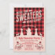 Christmas invitation for an old-fashioned Ugly Sweater Party with red and black plaid and snowmen, reindeer, and trees.