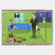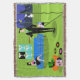 This Retro Urban Cartoon Couple Throw Blanket features the cartoon drawing of an elegantly decorated penthouse apartment, overlooking a city skyline. The apartment features a green floor and a green brick wall. On the wall are four Classic Movie Martini Stretched Canvas Prints, also available from StrangeLittleOnion's Zazzle store (hint, hint!). Three of the prints feature turquoise backgrounds and one is on a black background. Beneath the canvas prints, is a blue, mid century modern sofa. A sophisticated, raven-haired beauty is sitting on the sofa. She is wearing a classic, little, black dress with a hot pink bodice. On the opposite side of the room there is a suave, tall, dark, and handsome man. He is wearing a black suit, white shirt, and green tie. In one hand, he is holding a vinyl record album, and, in the other hand, he is holding a fun album cover. On the floor, there is an orange ottoman holding a green and black record player. Propped against the ottoman is another album cover with a record rolling out of the side. There are also three colourful vinyl albums scattered about the floor. Behind the man, we can see through the sliding glass doors onto a green balcony. A white cat wearing a pink collar is perched on the edge of the balcony. Beyond the cat, there is a breathtaking city skyline complete with skyscrapers and a yellow crescent moon. If this is how the other half lives, sign me up!