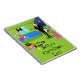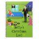 This customisable Retro Urban Christmas Couple Notebook features the cartoon drawing of an elegant penthouse apartment all decorated for the holidays with strands of colourful Christmas lights and a kitschy, pink, Christmas tree, complete with teal ornaments and a yellow star. The apartment features a green floor and a green brick wall. On the wall are four Classic Movie Martini Stretched Canvas Prints, also available from StrangeLittleOnion's Zazzle store (hint, hint!). Three of the prints feature turquoise backgrounds and one is on a black background. Beneath the canvas prints, is a blue, mid century modern sofa. A sophisticated, raven-haired beauty is sitting on the sofa. She is wearing a vibrant, red dress and Santa hat. In one hand, she is holding a sprig of mistletoe tied with a red bow. On the opposite side of the room there is a suave, tall, dark, and handsome man. He is wearing a black suit, white shirt, and red tie. In one hand, he is holding a vinyl record album, and, in the other hand, he is holding a fun album cover. On the floor, there is an orange ottoman holding a green and black record player. Propped against the ottoman is another album cover with a record rolling out of the side. There are also three colourful vinyl albums scattered about the floor. Behind the man, we can see, through sliding glass doors, snow falling onto a green balcony and the city below. A white cat wearing a red bow around its neck is perched on the edge of the balcony. Beyond the cat, there is a breathtaking city skyline complete with skyscrapers and a yellow crescent moon. Simply replace the existing text with your own. If this is how the other half lives, sign me up!