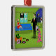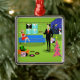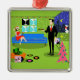 This Retro Urban Christmas Couple Ornament features the cartoon drawing of an elegant penthouse apartment all decorated for the holidays with strands of colourful Christmas lights and a kitschy, pink, Christmas tree, complete with teal ornaments and a yellow star. The apartment features a green floor and a green brick wall. On the wall are four Classic Movie Martini Stretched Canvas Prints, also available from StrangeLittleOnion's Zazzle store (hint, hint!). Three of the prints feature turquoise backgrounds and one is on a black background. Beneath the canvas prints, is a blue, mid century modern sofa. A sophisticated, raven-haired beauty is sitting on the sofa. She is wearing a vibrant, red dress and Santa hat. In one hand, she is holding a sprig of mistletoe tied with a red bow. On the opposite side of the room there is a suave, tall, dark, and handsome man. He is wearing a black suit, white shirt, and red tie. In one hand, he is holding a vinyl record album, and, in the other hand, he is holding a fun album cover. On the floor, there is an orange ottoman holding a green and black record player. Propped against the ottoman is another album cover with a record rolling out of the side. There are also three colourful vinyl albums scattered about the floor. Behind the man, we can see, through sliding glass doors, snow falling onto a green balcony and the city below. A white cat wearing a red bow around its neck is perched on the edge of the balcony. Beyond the cat, there is a breathtaking city skyline complete with skyscrapers and a yellow crescent moon. If this is how the other half lives, sign me up!
