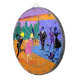 This Retro Urban Rooftop Party Dart Board is intoxicating in its detail. The cartoon design features the type of wildly sophisticated cocktail party that is normally only seen in movies from the 1960s. There is a lot for the partygoers to take in. From the comfort of a penthouse apartment, guests are enjoying the view and the ambiance. The lighting sets the mood and we are able to see the darkened silhouettes of an attractive couple dancing the cha-cha. On the floor, there is a purple, portable, record player at the feet of the dancing couple. Several albums have been scattered nearby. Even with the dimmed lighting that makes practically everything in the room appear in shades of purple, blue and black, we can tell that everyone is dressed to the nines. Behind the dancing, indoor couple, there is a gentleman in a black suit holding a martini glass. He is talking to a dark haired beauty who is standing near one of the floor to ceiling glass walls. From a lampstand, a single bulb is casting a romantic glow on the scene. The only thing missing is the lampshade. Hmm... Where is the shade? It's on the head of a tipsy man who has taken the party outside to the orange rooftop. He's clearly got some fine dance moves and he isn't afraid to show them to the world! His companion is a shapely, blonde woman in a bright pink dress. Her back is arched as she throws back her martini in an uninhibited fashion. Beyond the party, there is a breathtaking teal skyline, complete with skyscrapers and a purple sky. If this is how the other half lives, sign me up!