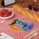This Retro Urban Rooftop Party Paper Plate is intoxicating in its detail. The cartoon design features the type of wildly sophisticated cocktail party that is normally only seen in movies from the 1960s. There is a lot for the partygoers to take in. From the comfort of a penthouse apartment, guests are enjoying the view and the ambiance. The lighting sets the mood and we are able to see the darkened silhouettes of an attractive couple dancing the cha-cha. On the floor, there is a purple, portable, record player at the feet of the dancing couple. Several albums have been scattered nearby. Even with the dimmed lighting that makes practically everything in the room appear in shades of purple, blue and black, we can tell that everyone is dressed to the nines. Behind the dancing, indoor couple, there is a gentleman in a black suit holding a martini glass. He is talking to a dark haired beauty who is standing near one of the floor to ceiling glass walls. From a lampstand, a single bulb is casting a romantic glow on the scene. The only thing missing is the lampshade. Hmm... Where is the shade? It's on the head of a tipsy man who has taken the party outside to the orange rooftop. He's clearly got some fine dance moves and he isn't afraid to show them to the world! His companion is a shapely, blonde woman in a bright pink dress. Her back is arched as she throws back her martini in an uninhibited fashion. Beyond the party, there is a breathtaking teal skyline, complete with skyscrapers and a purple sky. If this is how the other half lives, sign me up!