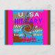 Introducing the "Retro USA Stronger Together Abstract Art Print," a captivating artwork that melds a retro aesthetic with powerful themes of unity and political significance. This piece features bold text arranged vertically, set against an abstract background filled with dynamic colours and shapes. The design conveys a message of unity and potential political significance with a distinct retro aesthetic, framed by magenta, blue, and brown borders