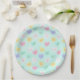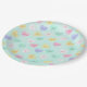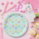 These cute party plates feature a retro style Valentine's Day theme. The background is a light teal paper pattern. Pastel coloured Valentine candy hearts are pictured with various sayings, messages, and love notes.