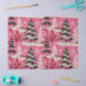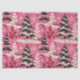Scattered across the pink canvas are delicate and intricately drawn black and white Christmas trees. These trees vary in size and style, creating a visually interesting pattern that captures the essence of a winter wonderland. The black outlines of the trees add a classic touch, reminiscent of vintage illustrations.