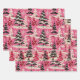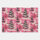 Scattered across the pink canvas are delicate and intricately drawn black and white Christmas trees. These trees vary in size and style, creating a visually interesting pattern that captures the essence of a winter wonderland. The black outlines of the trees add a classic touch, reminiscent of vintage illustrations.