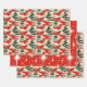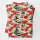 This vintage Christmas wrapping paper features a whimsical winter scene with fluffy clouds, snow-dusted pine trees adorned with red berries, and a touch of snow. The paper boasts a classic red background with a retro illustration style, evoking a sense of nostalgia and holiday cheer.