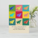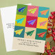 Send warm holiday wishes with timeless charm using this Retro Vintage Christmas Card. Featuring retro coloured squares with colourful paper aeroplanes designed with Christmas trees. Below the image sits the text "Merry Christmas and Happy New Year" andacustomizable option to add your family name. This nostalgic design captures the magic of a bygone era with a travel flair.