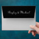 Add an extra touch to the arrival of your retro vinyl invitation or vintage vinyl record save the date available in smaller sizes for RSVPs and thank you notes. The front of this rectangular envelope has a record on the upper left corner. Your names curve around the record. Your return address is on the left side. The back flap is black and features your name in script. The interior of the envelope features a printed vinyl record pattern–an easy alternative to an envelope liner.