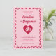 A hand-drawn, bold, and funky wedding invitation that blends vintage charm with modern flair. The design features a playful pink background framed by a wavy red outline, giving it a lively, retro vibe. The typography is fun, funky, and modern, with a nostalgic twist that makes the text pop in vibrant red. At the center, a heart motif with a cupid inside adds a whimsical, romantic touch, perfectly balancing elegance with cheeky charm.