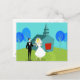This Retro Wedding Couple Postcard will have you hearing wedding bells. The 1960's style, minimalist art design features a bride and groom on their wedding day. The happy couple looks good enough to be standing atop a wedding cake. But they aren't. They're standing on lush, green grass. The debonaire Mr. is wearing a classic, black tuxedo with black bow tie. Down, ladies! He's taken! He is holding the hand of his beautiful Mrs., who looks positively radiant in her tea length, white gown with form fitting waist and flared skirt. She truly looks like a princess with her tiara and gauzy, white wedding veil resting on her pretty blonde head. Beside them, a path in the grass leads to the world's most charming chapel. The quaint, teal and turquoise church is the perfect setting for saying, "I do!" Yes, here is the church. Here is the steeple. We can only assume that, behind those bright red, double doors is a roomful of people just waiting to share in this couple's happiness. The picturesque setting also includes four, stylistic, cartoon trees in shades of blue. It's a beautiful day for a wedding, as we can see from the flawless aqua sky. The only thing missing from this mid century modern design is the rice, and we can assume that will be forthcoming. This design can be used as save the date cards, wedding thank you notes, informal invitations, and for congratulating your favourite newlyweds.
