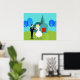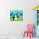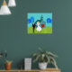 This Retro Wedding Couple Poster will have you hearing wedding bells. The 1960's style, minimalist art design features a bride and groom on their wedding day. The happy couple looks good enough to be standing atop a wedding cake. But they aren't. They're standing on lush, green grass. The debonaire Mr. is wearing a classic, black tuxedo with black bow tie. Down, ladies! He's taken! He is holding the hand of his beautiful Mrs., who looks positively radiant in her tea length, white gown with form fitting waist and flared skirt. She truly looks like a princess with her tiara and gauzy, white wedding veil resting on her pretty blonde head. Beside them, a path in the grass leads to the world's most charming chapel. The quaint, teal and turquoise church is the perfect setting for saying, "I do!" Yes, here is the church. Here is the steeple. We can only assume that, behind those bright red, double doors is a roomful of people just waiting to share in this couple's happiness. The picturesque setting also includes four, stylistic, cartoon trees in shades of blue. It's a beautiful day for a wedding, as we can see from the flawless aqua sky. The only thing missing from this mid century modern design is the rice, and we can assume that will be forthcoming. This design bridal shops, wedding planners, and for congratulating your favourite newlyweds.