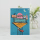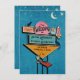 Retro Wedding Invite Sign wedding invitation card. Send out this fun, vintage billboard sign in teal blue and pink with a rocket, stars, cocktail, and black cats to your family and friends for your big wedding bash. Add your details, location, and RSVP information to the card and you're all set.