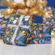 Christmas characters such as Santa Claus, an angel, a nutcracker and ballet dancer are tucked into flowers, stars, dots and candy to create a fanciful and whimsical holiday print. Merry Christmas is written in a bright white retro font.