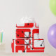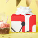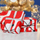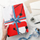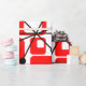 This retro wrapping paper is covered with mid-century modern red squares and black starbursts.