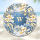 This tropical look coaster features a retro hibiscus flower, palm trees, and blue pattern. It's reminiscent of classic Hawaii or Tahiti, almost like a tropical shirt pattern. Your monogram initial appears in yellow against a blue floral background, which has a simulated brushed metal look, in the center. This nostalgic design might remind you of tropical beaches and relaxing waves whenever you see it. Make sure to type your initial in the Personalize section.
