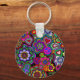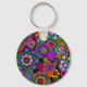 A keychain with a lively and colourful design of peace signs, paisley, ankhs, hearts, and flowers. A far-out flash back to the 1960's.