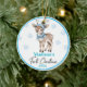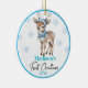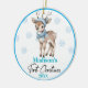 This sweet Christmas ornament has a cute reindeer on one side wearing a blue hat and scarf.... It says First Christmas and you put in the baby's name with the template provided and the year at the bottom. The reverse side has a cute snowman wearing a blue hat and blue scarf. This would be a wonderful keepsake for a new parent. A coordinating round circle is on both sides of the ornament.