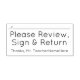 This neutral rubber stamp design features the message "Please Review, Sign & Return", and a line where a signature or initials could be written above. It also features a customisable teacher’s name. It might be be used by a tutor, teacher or educator to ask a student’s parent(s) or guardian(s) to review and acknowledge the grade that a student received on a test, a quiz, an exam, an essay, or some other school assignment.