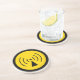Sandstone coaster with a yellow and black radio frequency warning symbol.