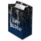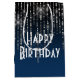 Rows of hanging sparkling rhinestone bling on gradient blue and black background for birthday.