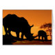 A silhouette of a rhino mother and her calf drink from the local water hole while the sun sets behind them. Computer art by Kathie Miller