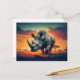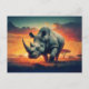 A majestic rhinoceros stands tall against a vibrant sunset, its form composed of intricate geometric shapes. The African savanna stretches out behind it, dotted with acacia trees.