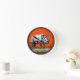 Stylised depiction of a rhinoceros presented in a circular format. The rhino is displayed in a dynamic pose, showcasing its prominent horn and robust body. The background is a vivid orange colour, which contrasts with the black edges of the circle, creating a striking visual effect. The ground beneath the rhino is illustrated with subtle details, resembling a textured landscape. Surrounding the rhino are thorny bushes or stylised vegetation. The overall style combines realism with artistic flair, producing an eye-catching and impactful composition.